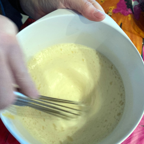 4 Eigelb | In einer grossen Schüssel die Eigelbe mit dem Schneebesen verrühren. Langsam die warme Sahnemasse in die Eigelbe giessen und dabei vorsichtig rühren. Die Masse soll nicht schäumen. |