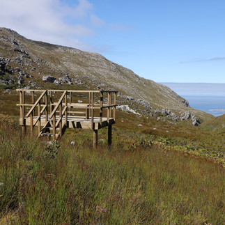 André, unser Vermieter fährt uns zum Kogelberg NP. Dort gibt es eine sehr schöne Wanderung, den Oudebosch Trail, den man nur machen kann wenn man 2 Autos hat, oder zum Startpunkt gefahren wird (7,5 km 400 Höhenmeter). Der NP kostet 60 Rand p.P. Eintritt (cash only). Dafür gibt es ein Permit und eine Einweisung. Man steigt in ein langes Tal hinauf. Ohne Wind wird es schon ziemlich warm. Oben geht es dann über einen Sattel. Von dort aus sieht man hinunter auf Betty's Bay. Dann geht es auf einem recht exponierten Pfad an einer Schlucht entlang und über einen Zig-Zag Weg sehr steil hinunter zum Harold Porter Park. Dort haben wir am Morgen geparkt.